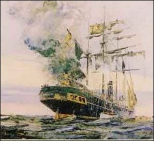 The Sarah Sands was a troopship, carrying soldiers and their families from Britain out to India, via South Africa, in 1857. A devastating fire breaks out on board in the Indian Ocean. The families take to the boats, but the soldiers, by heroic efforts and ordered discipline, succeed in unloading the gunpowder and ammunition thay are carrying, and throwing it overboard. The fire dies down at last, leaving the after end of the ship in ruins (see above) but they re–embark the families and succeed in getting to Mauritus and safety. (notes)