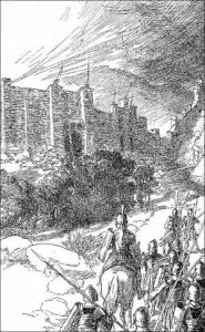 With Puck they meet Sir Richard Dalyngridge, a Norman soldier, who had fought with William’s invading army at Hastings in 1066. Inland he is given the Manor held by his Saxon friend Hugh, if he can hold it. They make common cause against marauders to defend the manor, Norman soldiers and Saxon peasants fighting side by side. It bodes well for the future.