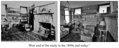 The 1890s picture is from Marlboro College. (53) One corner of this room is particularly familiar from the often reproduced photograph of Kipling posing there, pipe in mouth. The shelving is original, although the books and the ornaments are not. The plaster statue of Grey Brother in the photograph, given to Kipling by Joel Chandler Harris, is now in the small attic museum described later. The plaster frieze in the photograph is no longer in the house, although a number of smaller casts hang in its place today, absent any obvious indication of maker. A crude wooden revolving bookcase is readily identifiable from Kipling’s own photographs of the room. Across the upper part of the east-facing bay of the study is the carved teak cornice given to Kipling by Lockwood de Forest, the furniture designer and artist. (52)