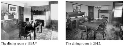 Passing through the large sliding doorway to the dining room, we find Kipling’s original table, sideboard and china cabinet. The sideboard was made by, and may well have been another gift from, Lockwood de Forest and is “a solid, emphatically rectilinear piece made of oak and accented with panels of carved teakwood”. (60) It can be identified from period photographs.