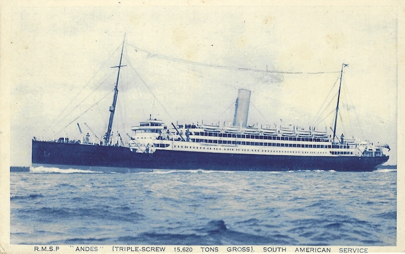 the South American boats The liners plying between Europe and South America. The Kiplings sailed on the Royal Mail SS Andes, 15,000 tons, triple screw, launched in 1913. Royal Mail was the premier line on this route from 1839 through to its demise in the 1980s. (We are indebted to Martin Scott, Navigating Officer with that line from 1960 to 1970, for the picture of the SS Andes at the top of the page.)