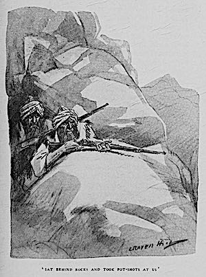 ‘At last, near midnight, I heard the wop, wop, wop, of Stalky’s Martinis across the valley, and some general cursing among the Malôts, whose main body was hid from us by a fold in the hillside. Stalky was brownin’ ’em at a great rate, and very naturally they turned half right and began to blaze at their faithless allies, the Khye-Kheens—regular volley firin’. In less than ten minutes after Stalky opened the diversion they were going it hammer and tongs, both sides the valley. When we could see, the valley was rather a mixed-up affair. The Khye-Kheens had streamed out of their sungars above the gorge to chastise the Malôts, and Stalky—I was watching him through my glasses—had slipped in behind ’em. Very good. The Khye-Kheens had to leg it along the hillside up to where the gorge got shallow and they could cross over to the Malôts, who were awfully cheered to see the Khye-Kheens taken in the rear.